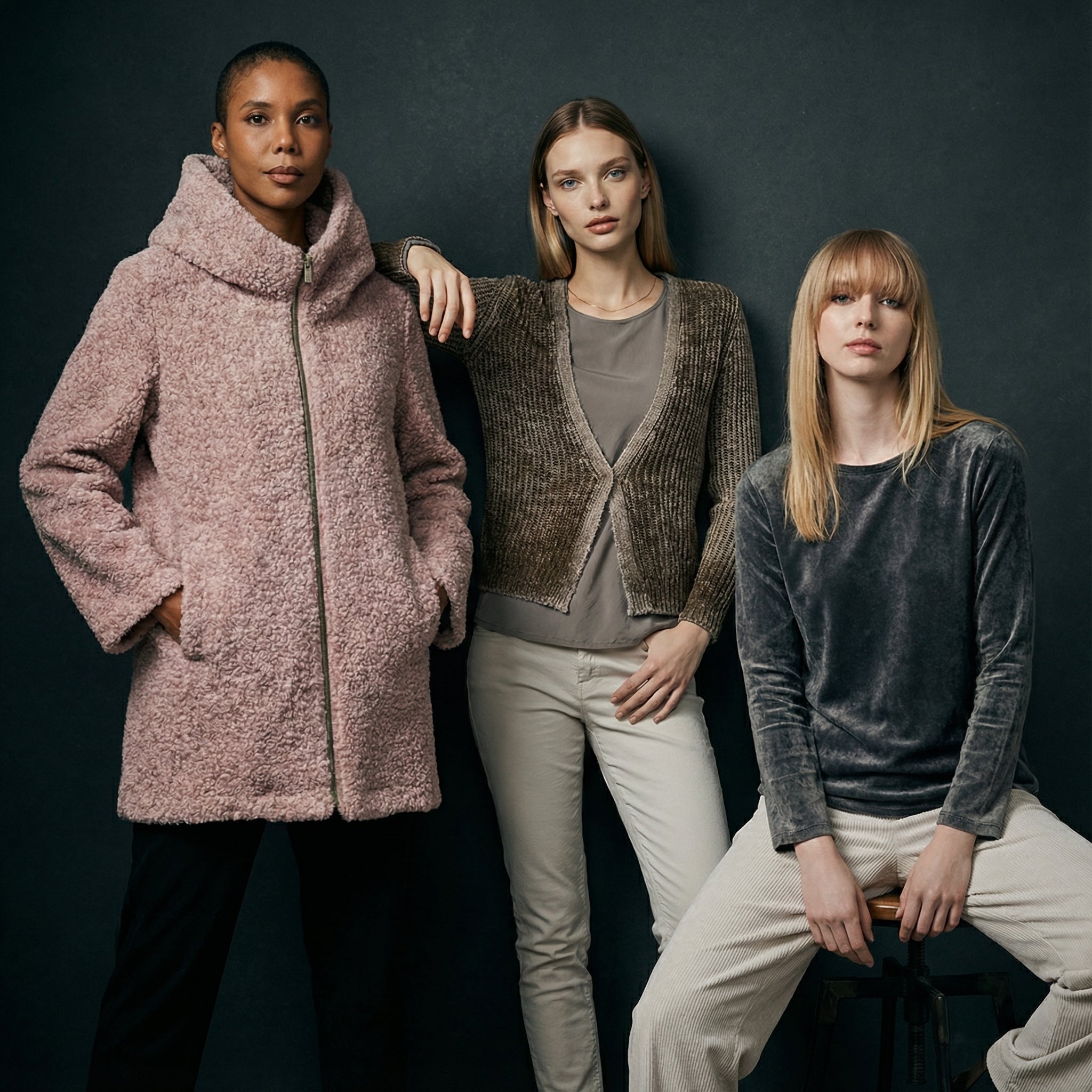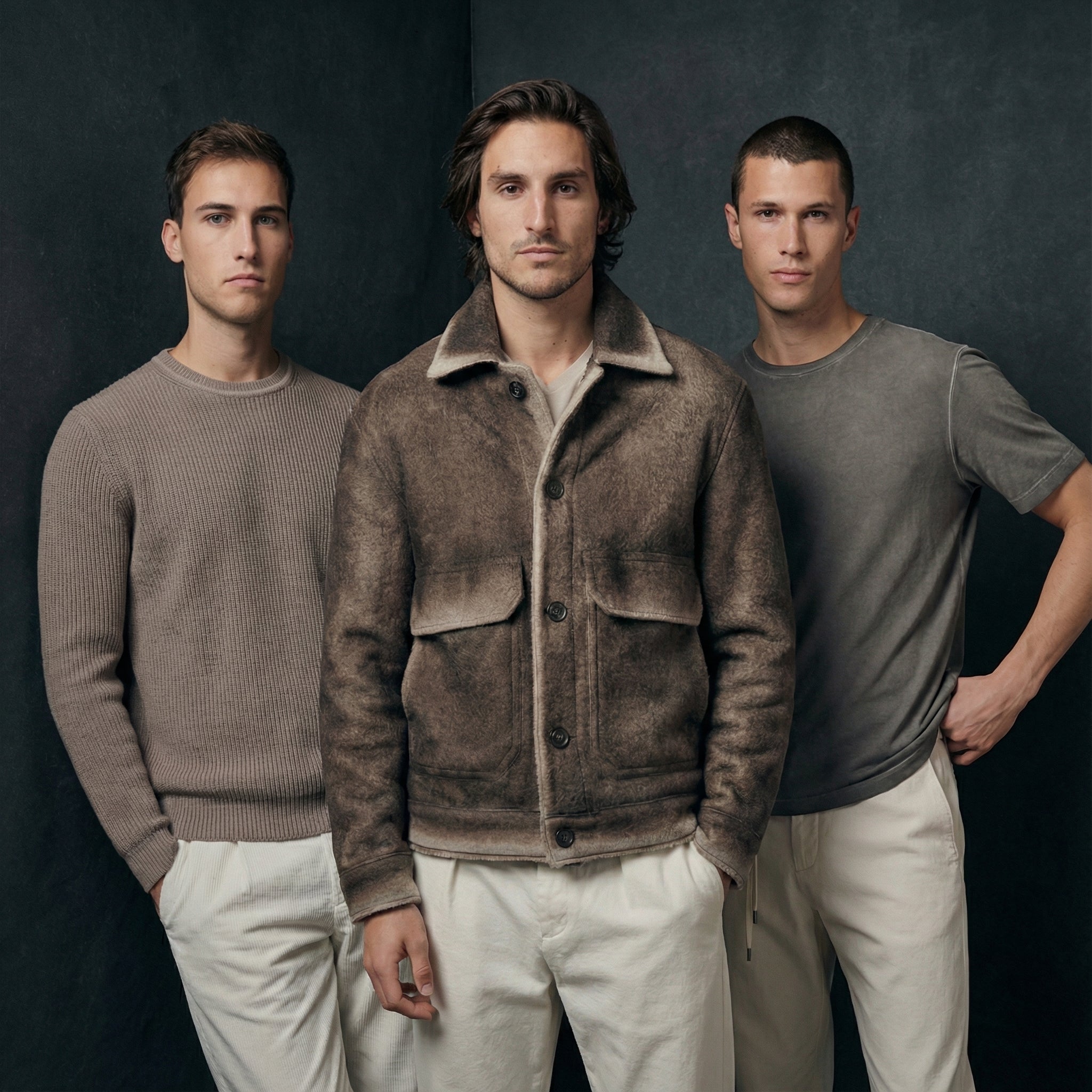 Le collezioni Ploumanac’h sono realizzate con fibre naturali come cashmere, lana merino, viscosa, lino e cotone. I processi di tintura distintivi del marchio, tra cui Soffio, Spray e Rainbow, creano sottili variazioni di tono e profondità in ogni modello, definendo un’estetica caratteristica radicata nel know-how italiano.