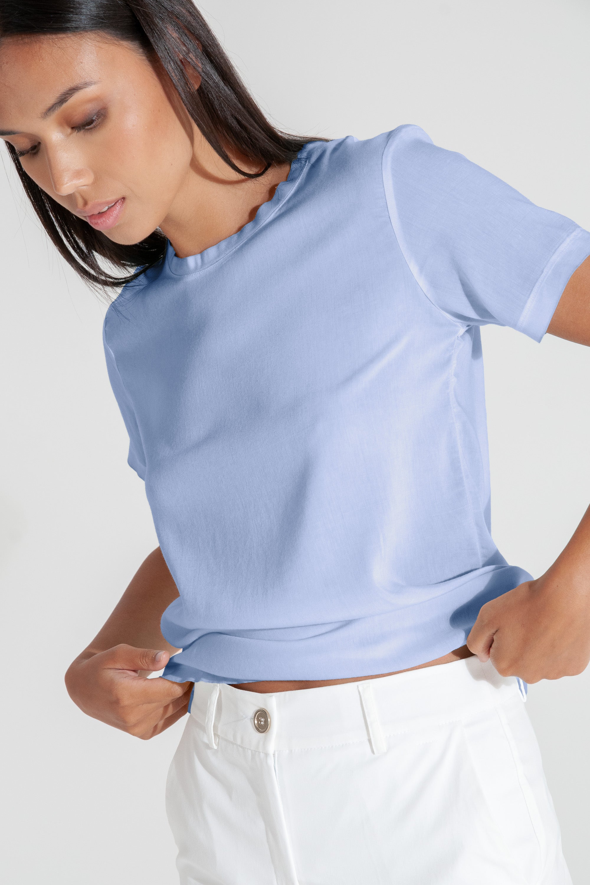 With a regular fit, straight hem and short sleeves, the Sammie T-shirt by Ploumanac’h is an easy way to dress up your basics. It is made of breathable, lightweight material that flatters your figure by hugging your curves yet staying fresh and light. Pair it with the matching skirt or mix it up with jeans, leggings or shorts.