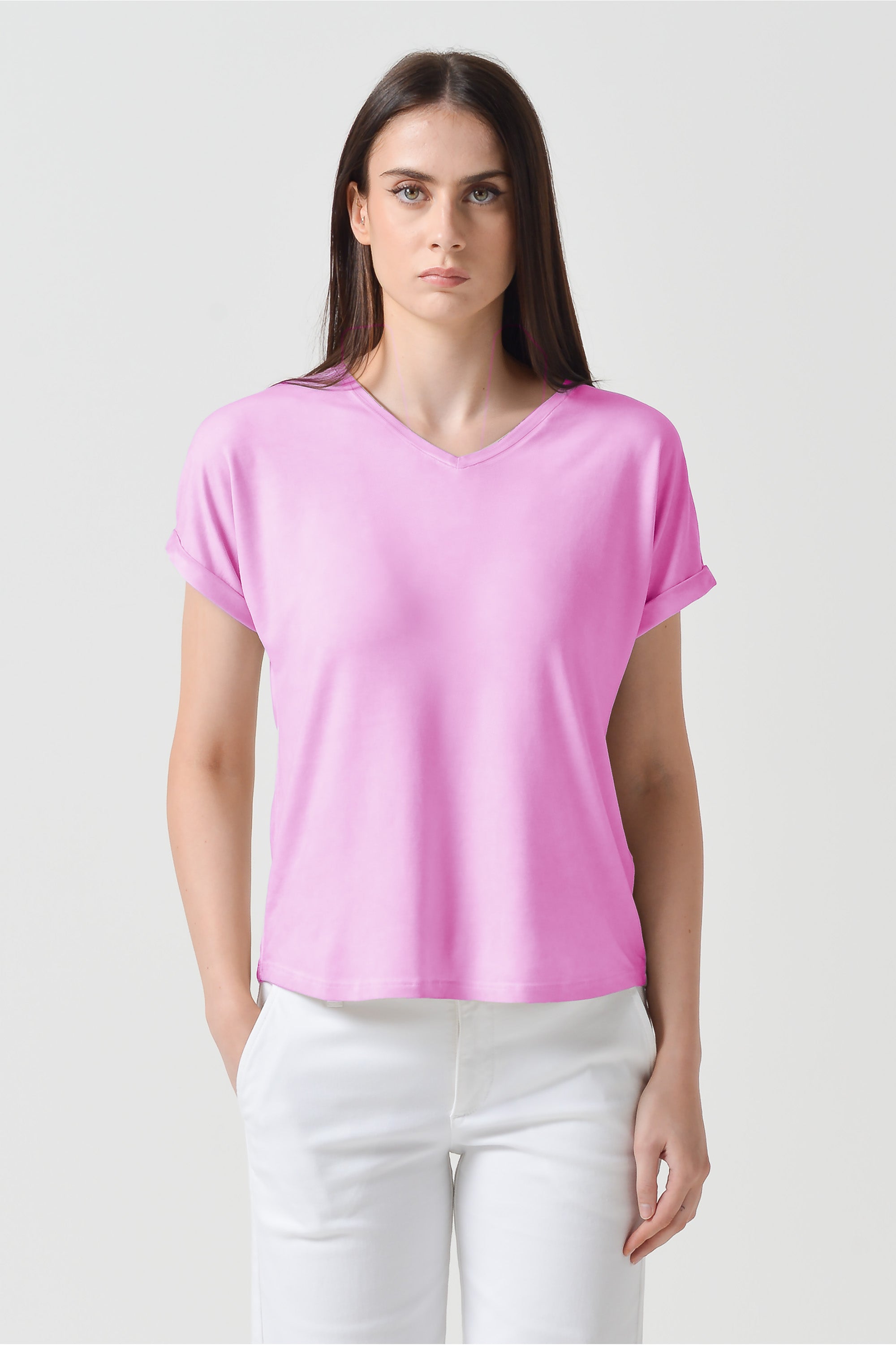 Slim fit Viscose Jersey T-Shirt with a V-neck and short sleeves. Colored using the Rainbow technique for a vibrant, distressed effect. Details are intentionally left lightly untouched for visual interest.