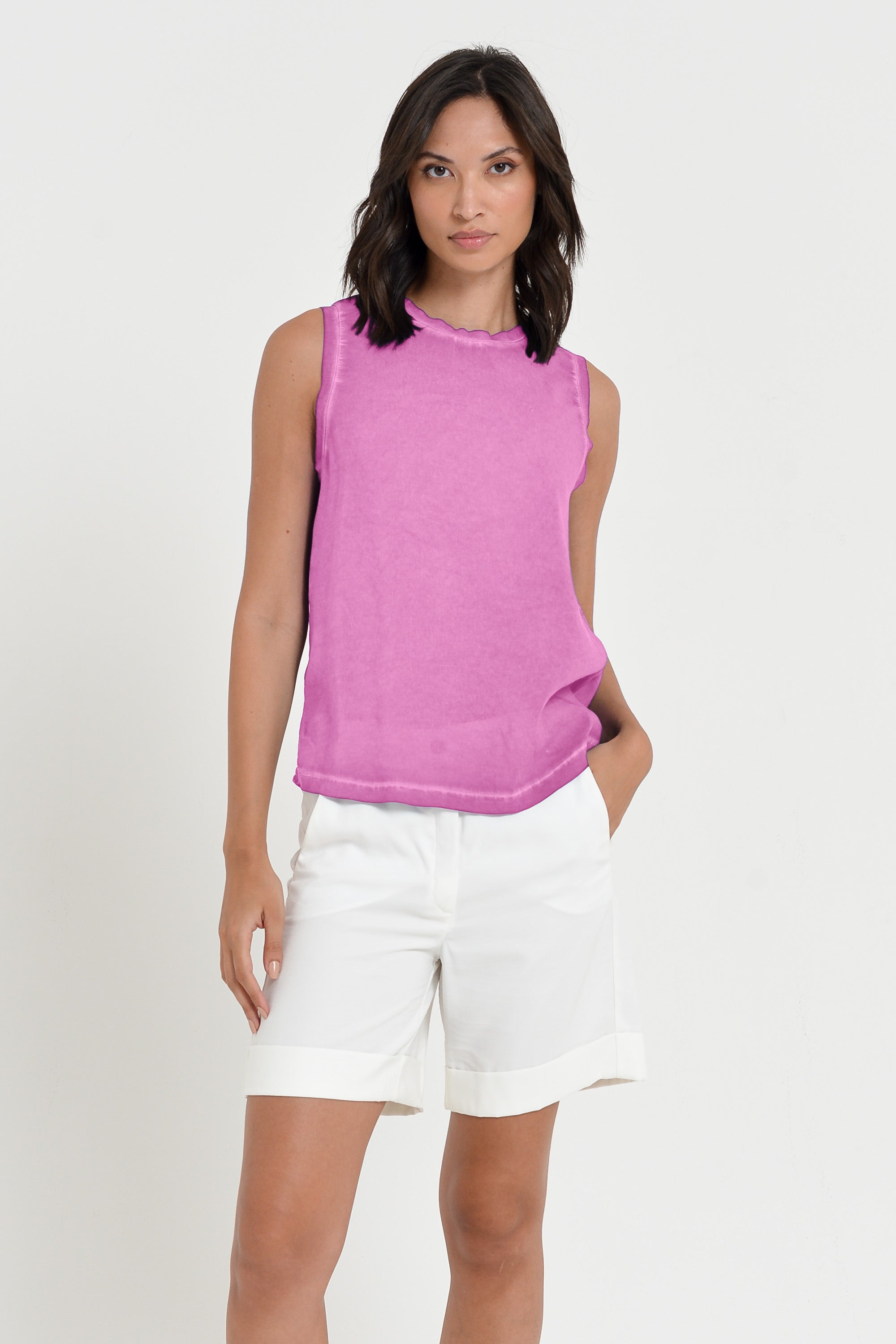 Slim fit tank made from light viscose. Features a crew neck and sleeveless design. Colored using a rainbow technique with layered pigments for a vibrant, distressed effect, leaving some details untouched.
