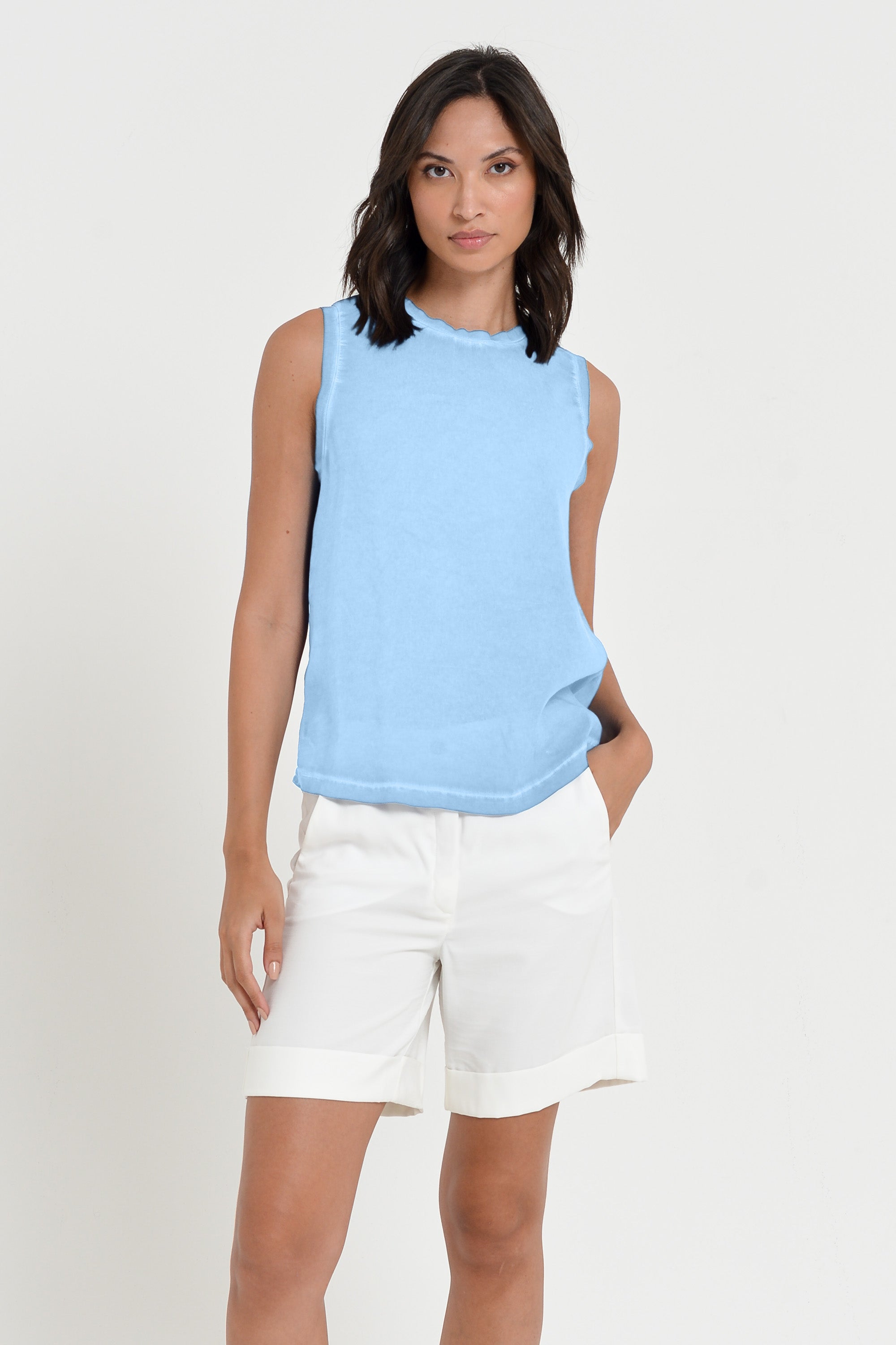 Slim fit tank made from light viscose. Features a crew neck and sleeveless design. Colored using a rainbow technique with layered pigments for a vibrant, distressed effect, leaving some details untouched.