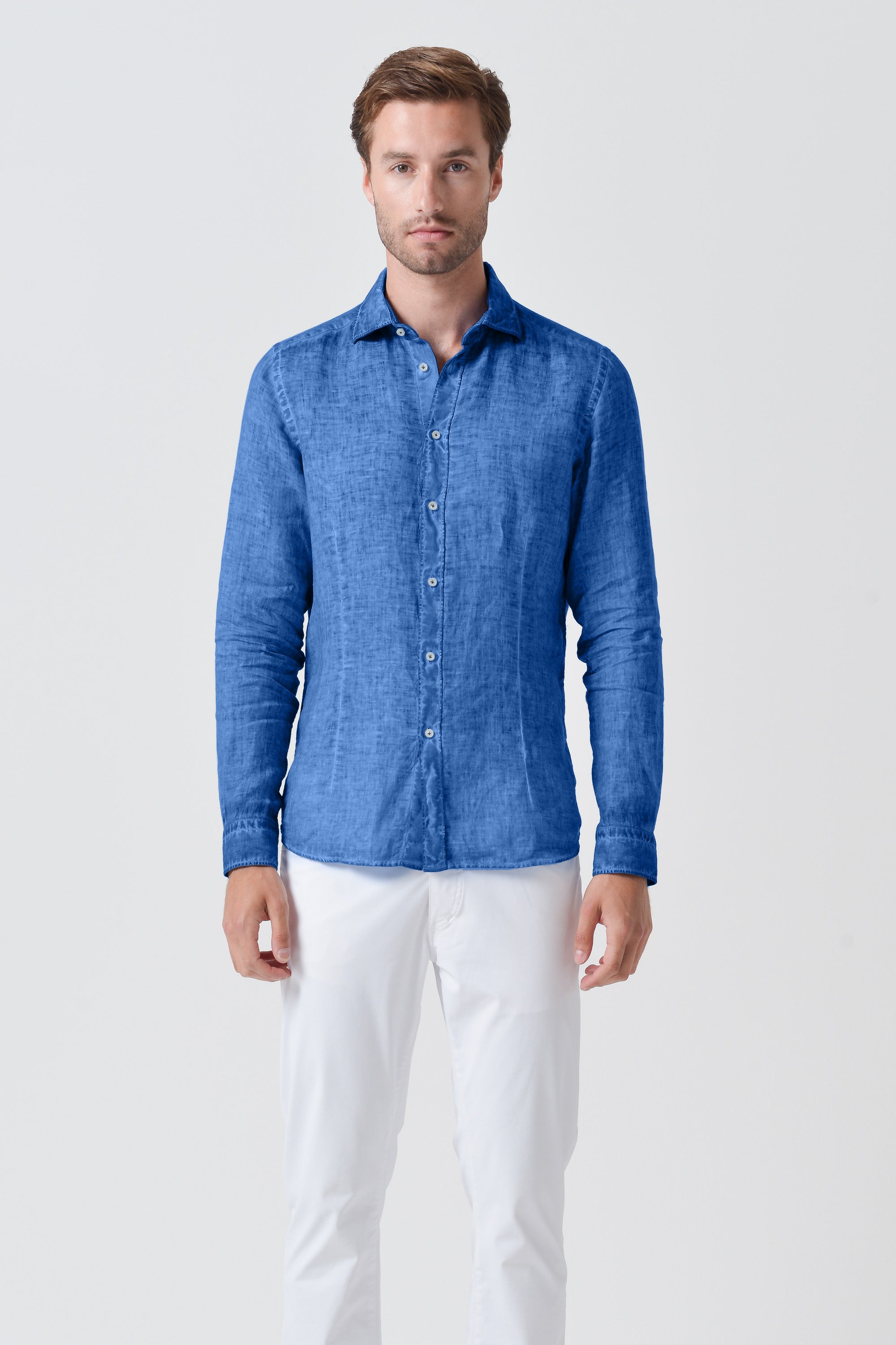 Slim fit linen shirt with spread collar, long sleeves, and darts into the front and back. Colored using rainbow technique for a vibrant, distressed effect. Breathable and intentionally left details lightly untouched for visual intrigue.
